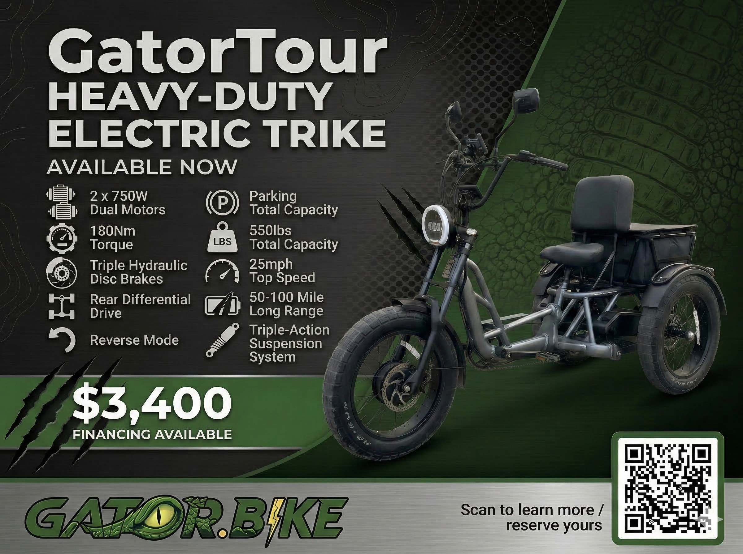 The GatorTour is about confidence and versatility — easier to load, easier to ride, and easier to maneuver, with more comfort on longer outings. From neighborhood cruising to hauling gear around your property, this trike is built to do more.